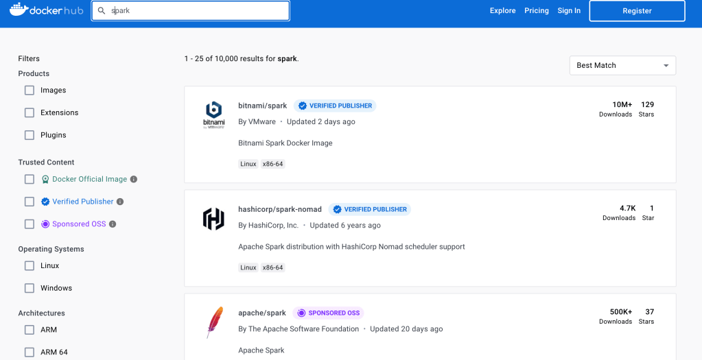 For example, I want Spark to be installed in my system. I go to docker hub and search for spark and I get list of images from there