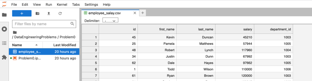 First for both, we need to load data into Dataframe. First open Jupyter Lab and create one file and paste CSV data into that file.