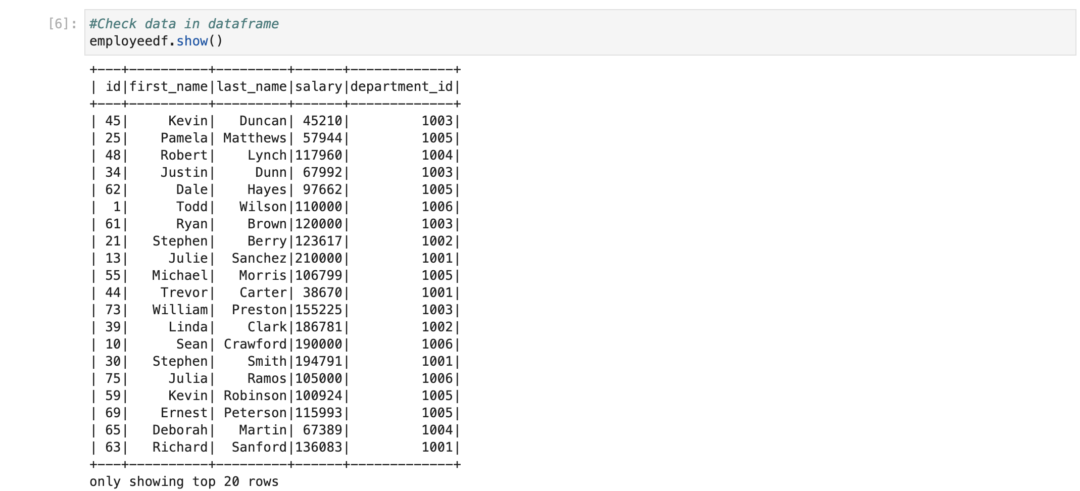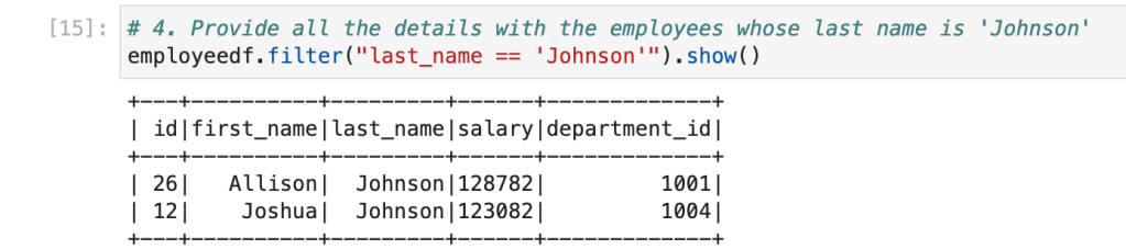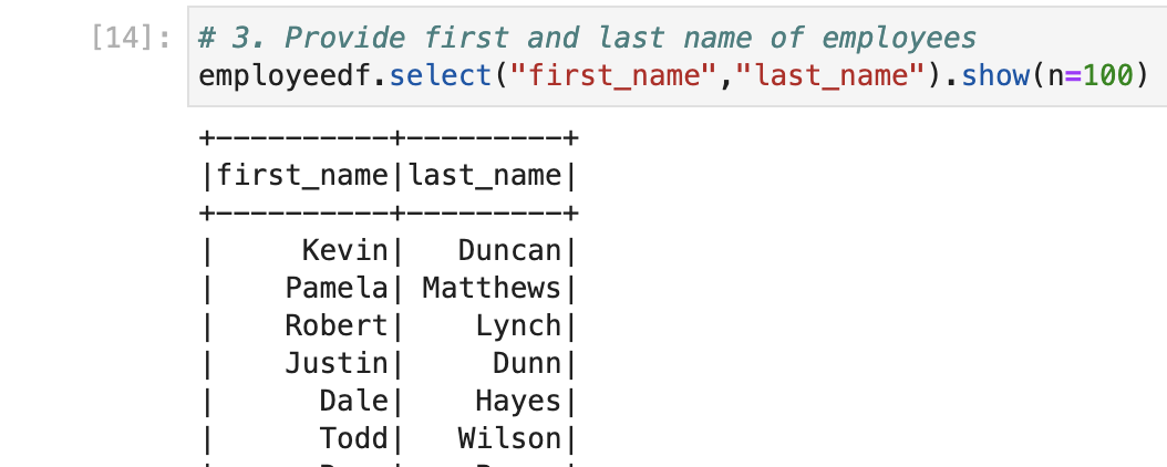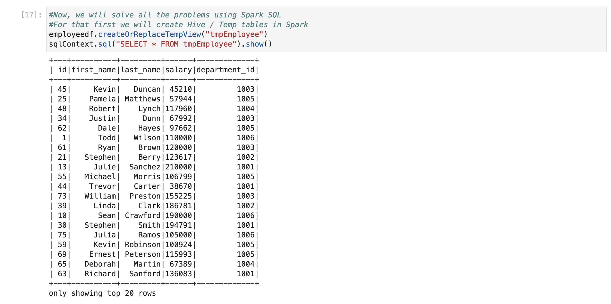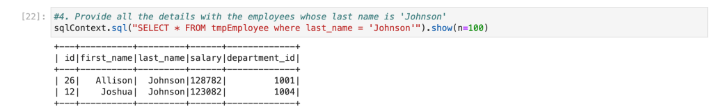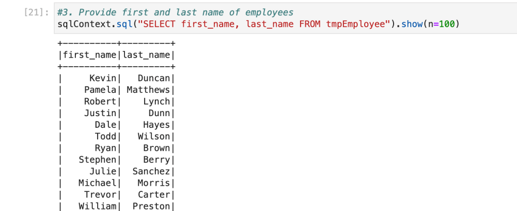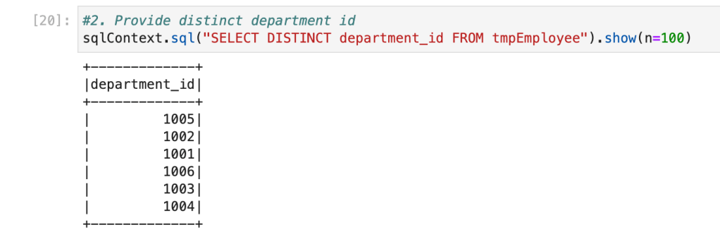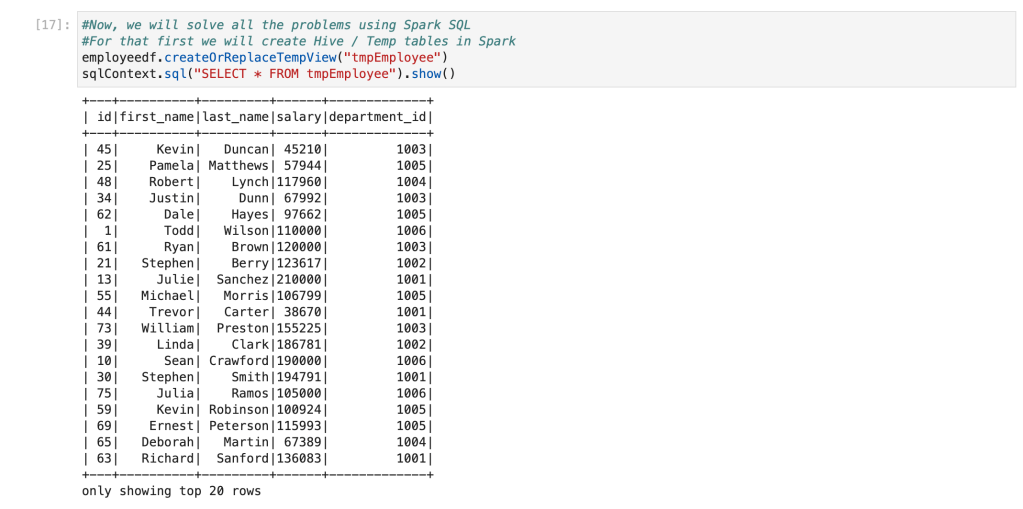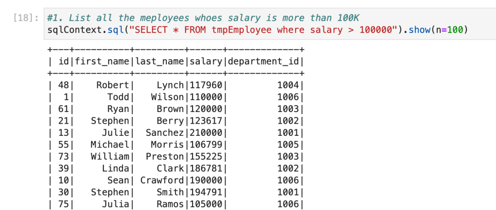 Now, we have a table with the name ‘tmpEmployee‘ available. We can write similar queries which we wrote for PostgreSQL. Spark SQL has almost similar syntax to ANSI SQL.
