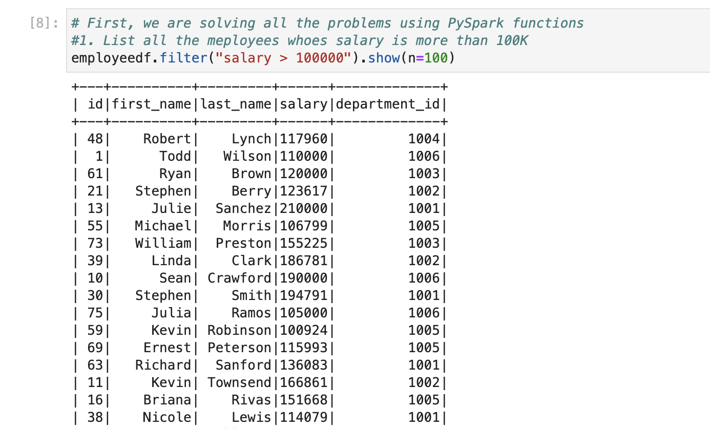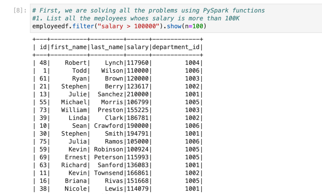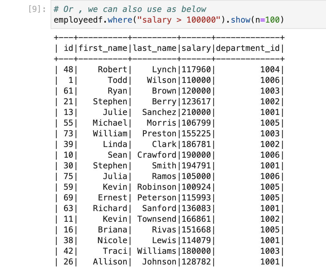For this, we will use where condition and apply filter using greater than 100K. So, our query will be as below and also, we need all the data so we can use ‘*’ or can pass all the columns name.