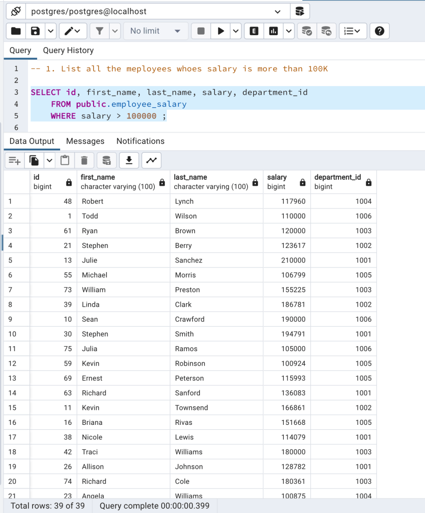 As output, we are getting all the employees whose salary is more than 100k. In total we are getting 39 rows.