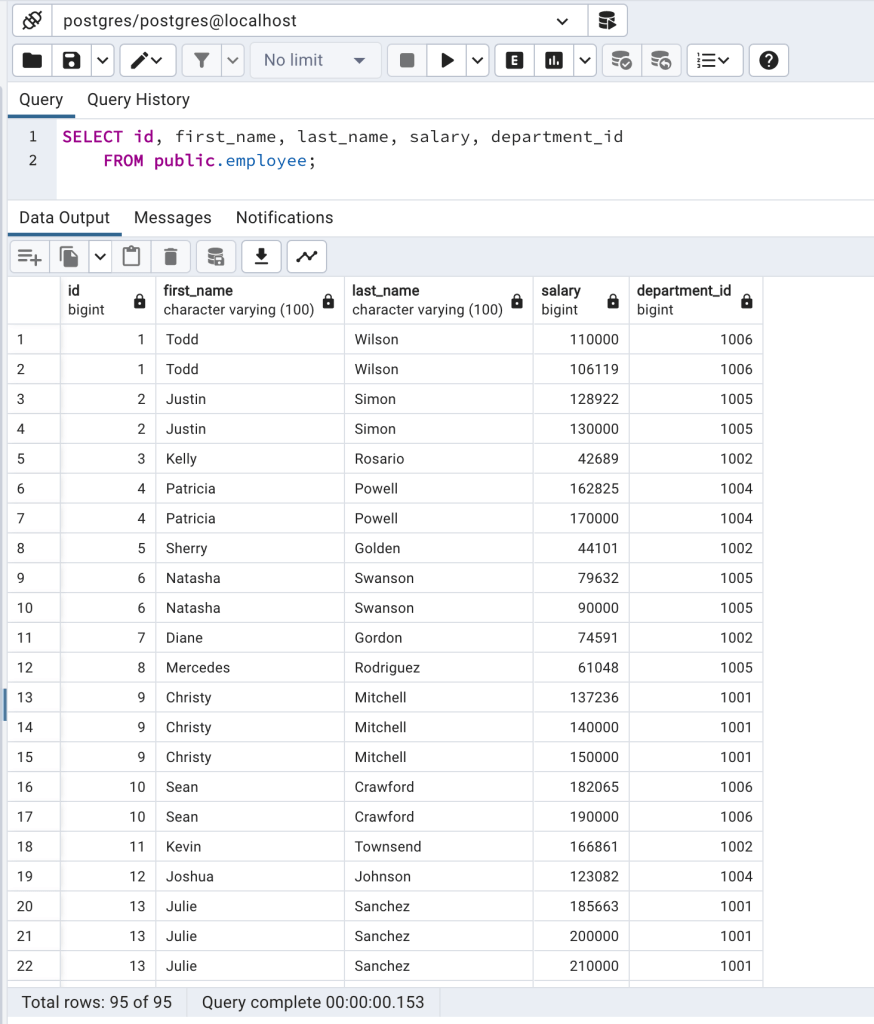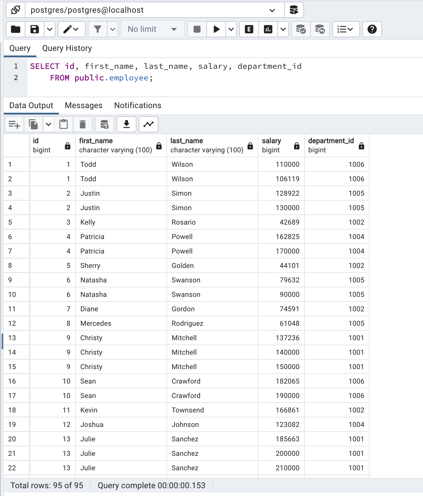 We see that in table we have total 95 rows and with each user (first and last name) we see two entries with salary.
