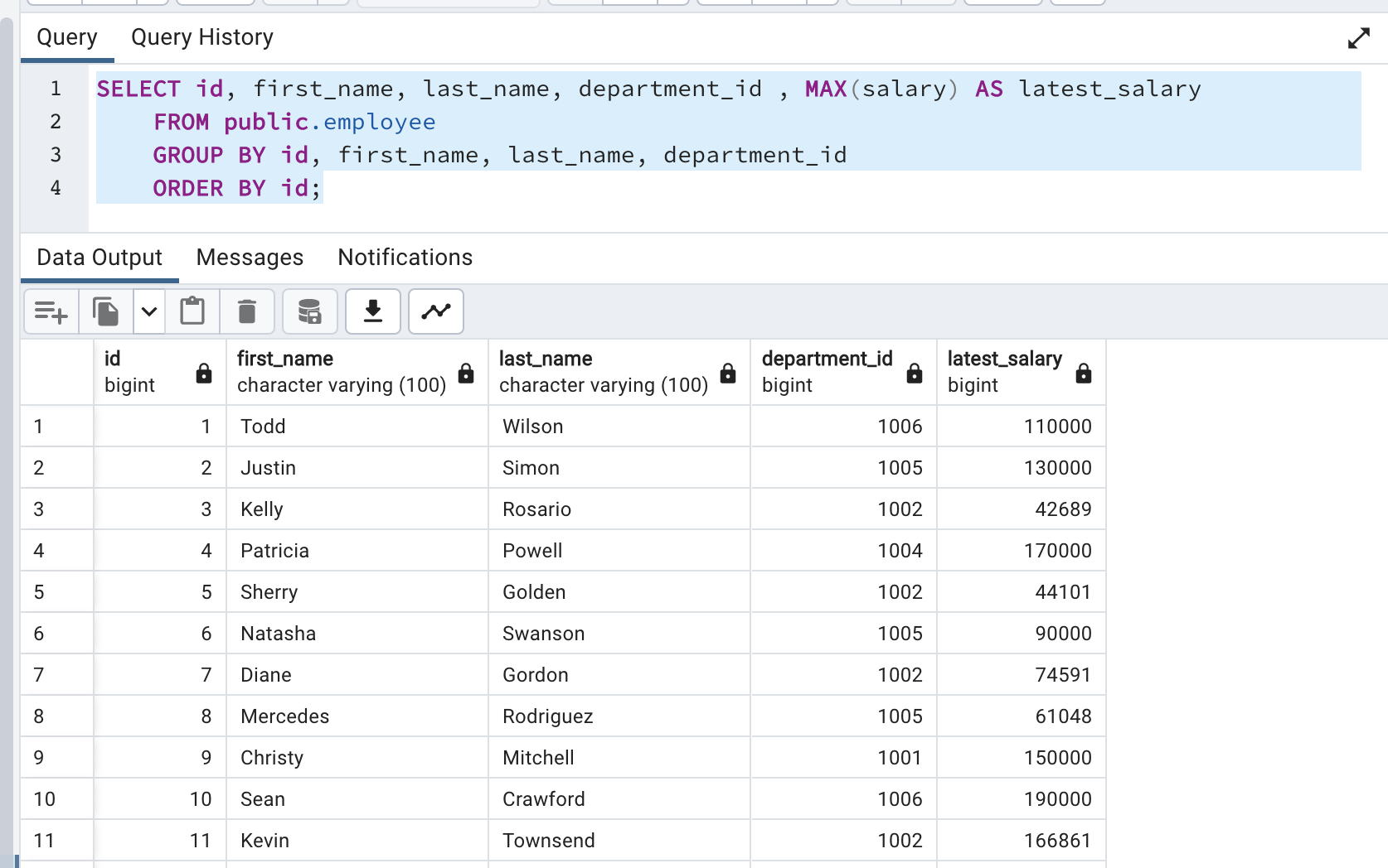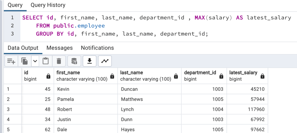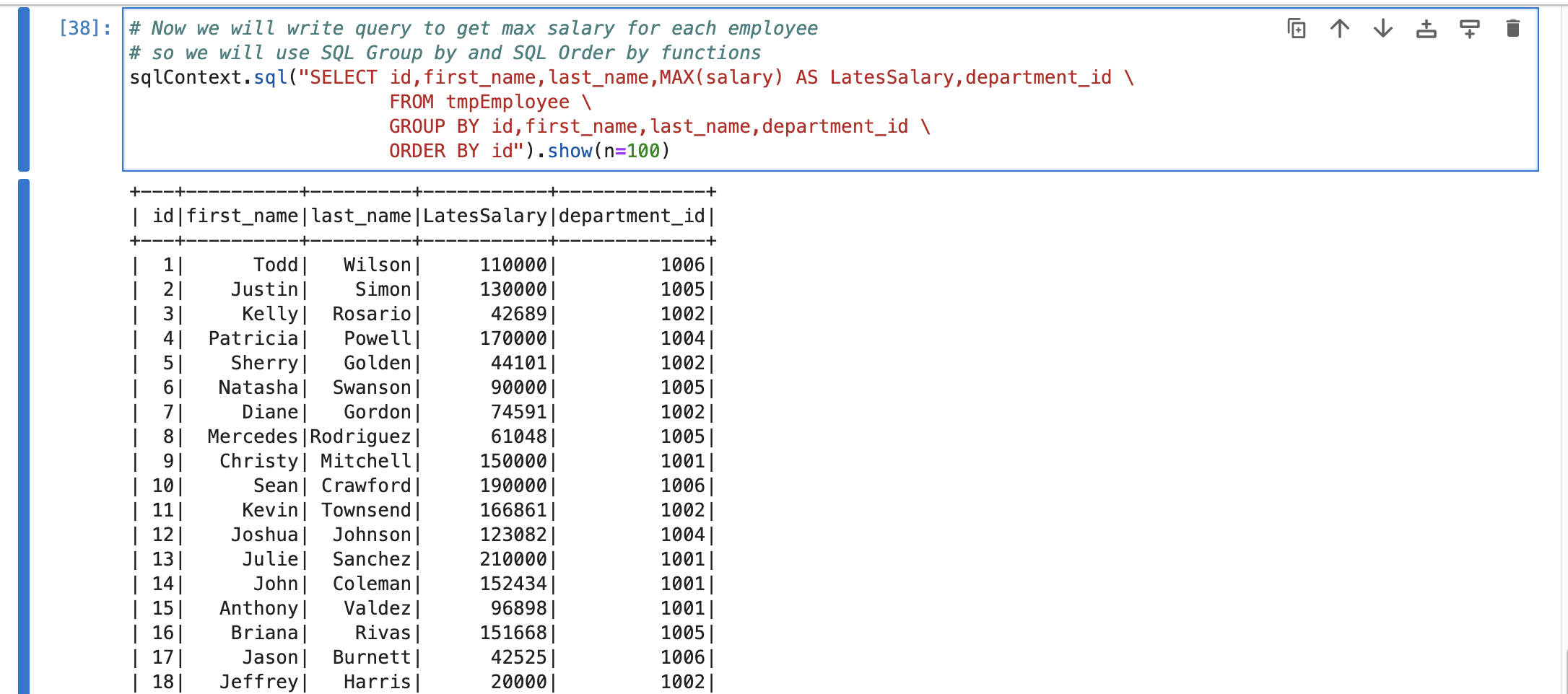 sqlContext.sql("SELECT id,first_name,last_name,MAX(salary) AS LatesSalary,department_id \