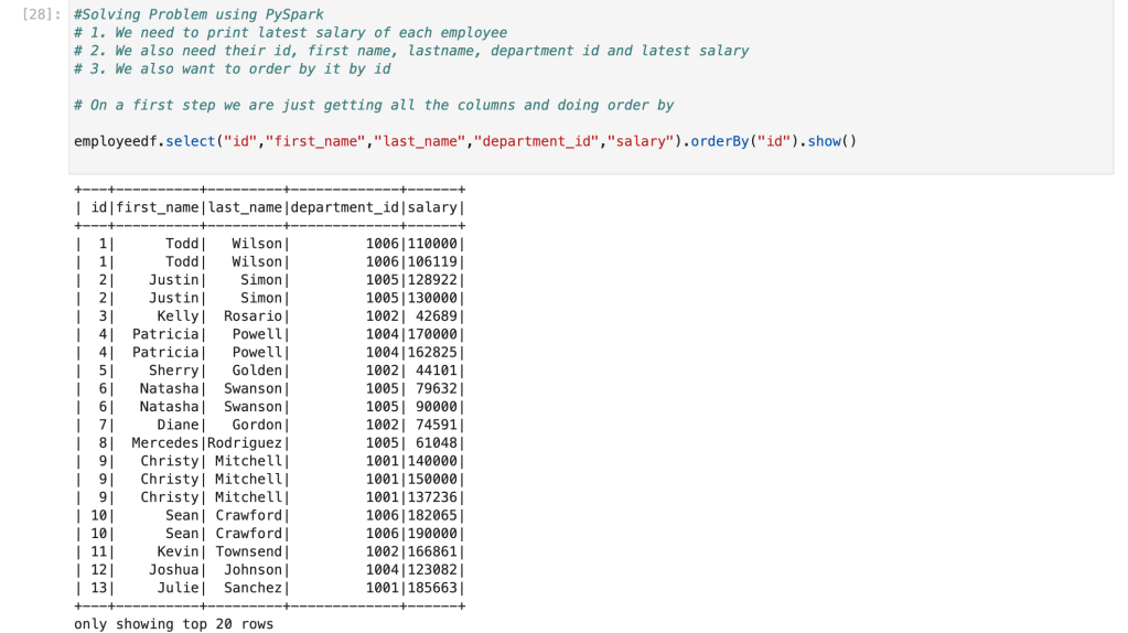 Here also, we will break down problems. And first we will do easy things, which is specifying required columns and we will also do order by using ‘orderBy()’ function into PySpark.