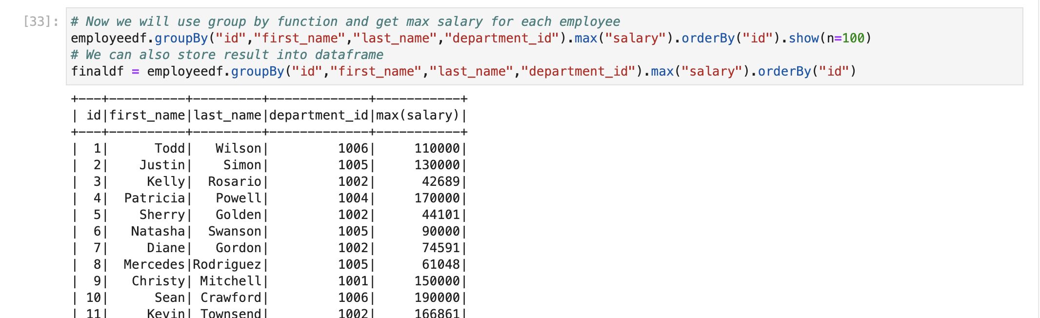 employeedf.groupBy("id","first_name","last_name","department_id").max("salary").orderBy("id").show(n=100)