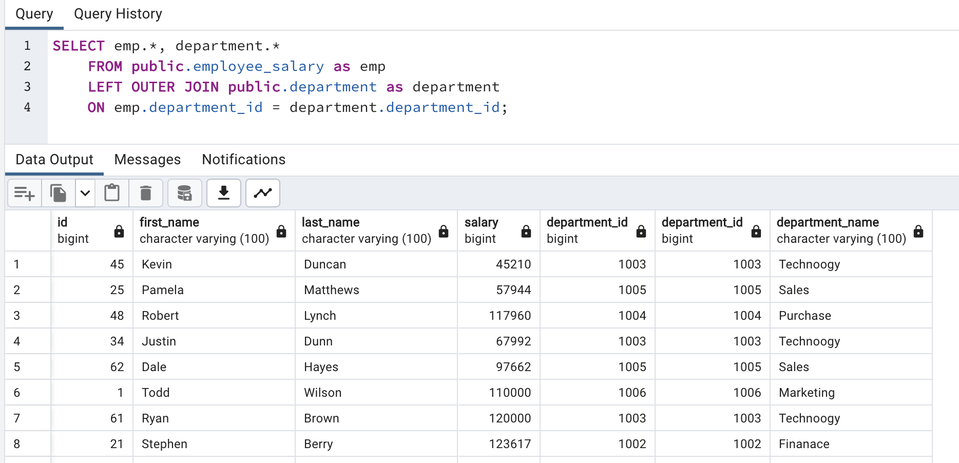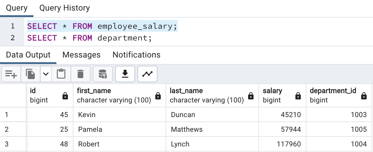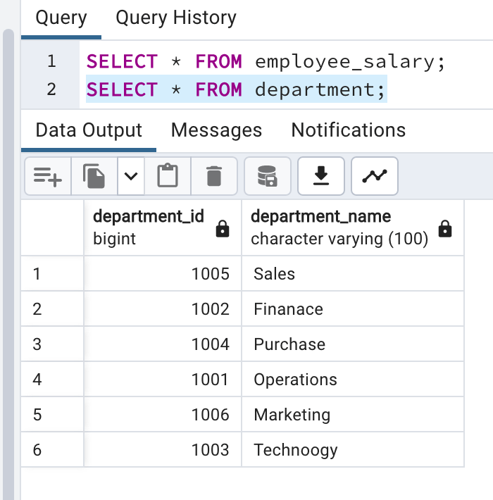 Here, we see that the employee salary table is having department id and department details are stored into the department master table. So, we need to join both tables if we need depart name details.