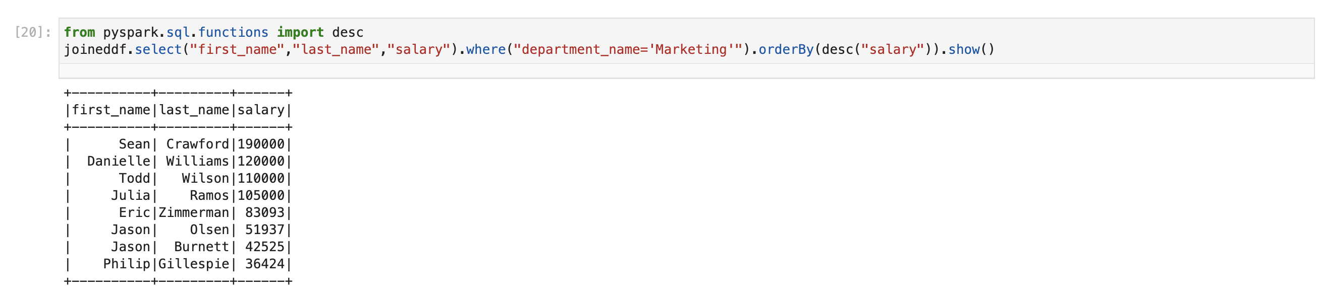 Second step is filtering this using “Marketing” and display salary in highest to lowest order