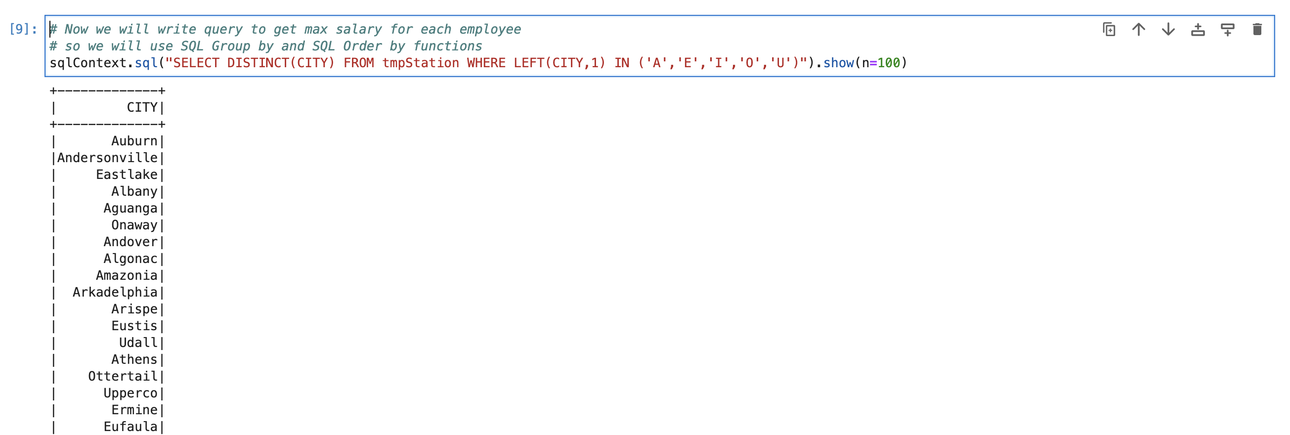 sqlContext.sql("SELECT DISTINCT(CITY) FROM tmpStation WHERE LEFT(CITY,1) IN ('A','E','I','O','U')").show(n=100)