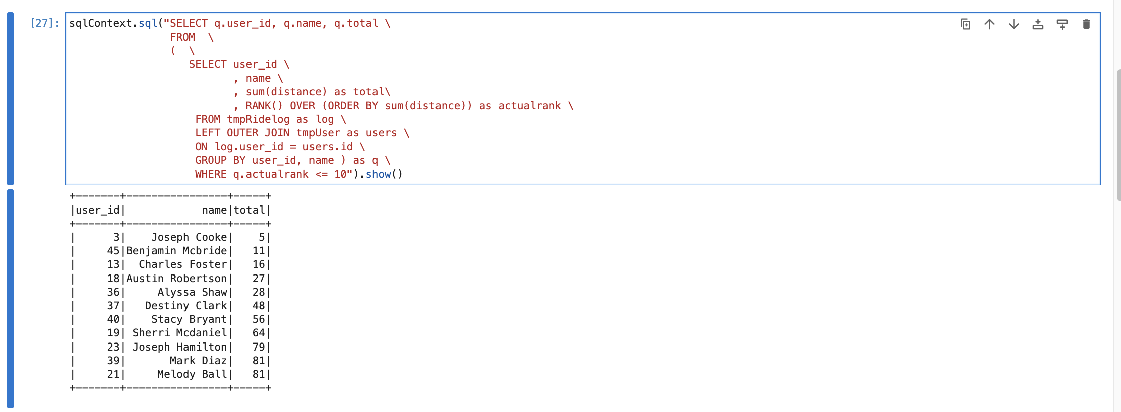 - Once we have a rank for each user based on distance travelled, we will write a select query on top of that and apply filter to get top 10 users.