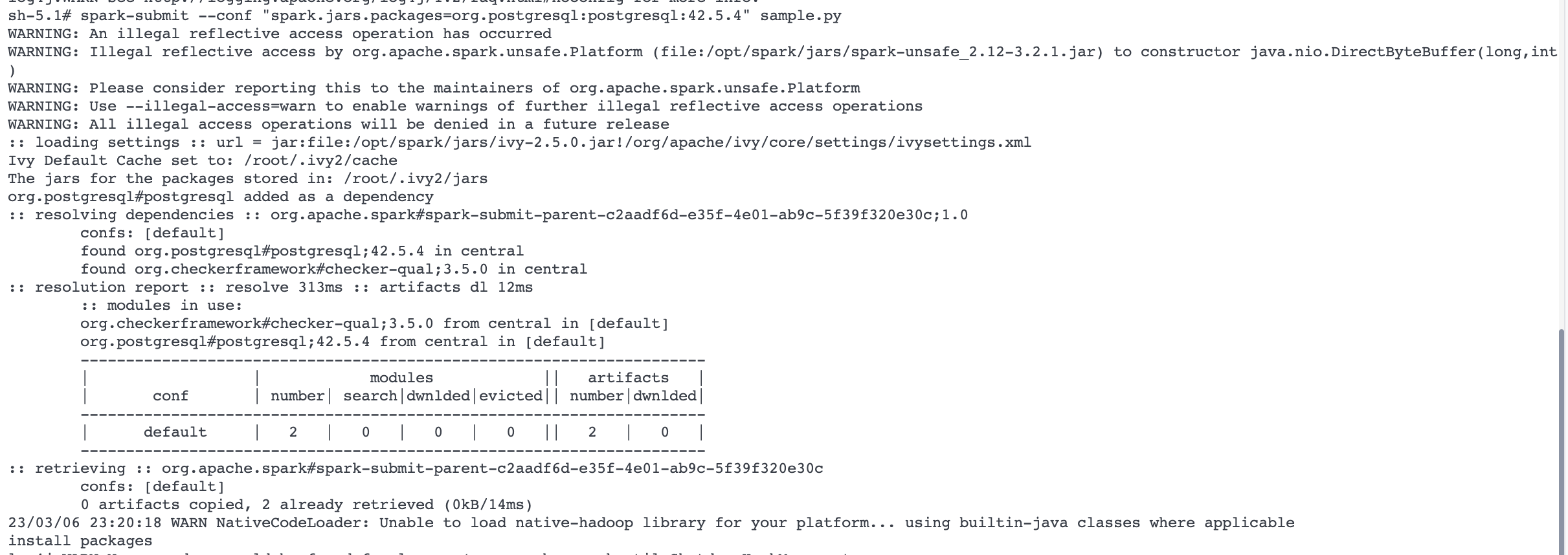 spark-submit --conf "spark.jars.packages=org.postgresql:postgresql:42.5.4" sample.py