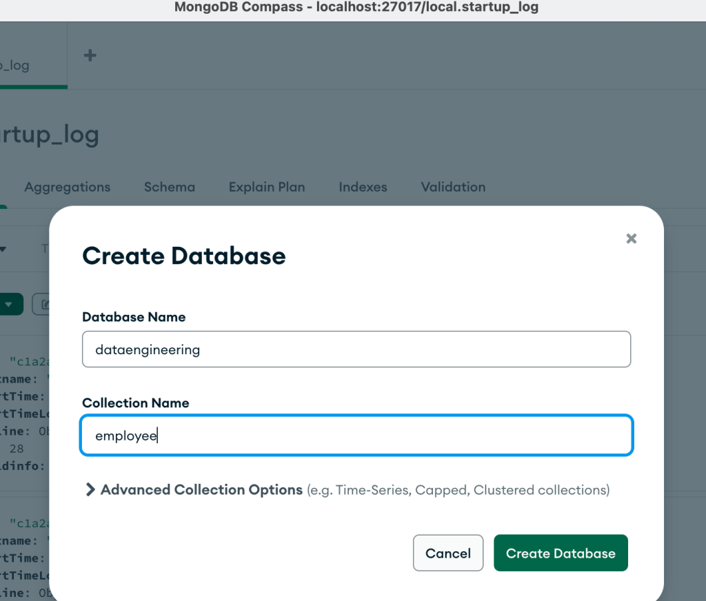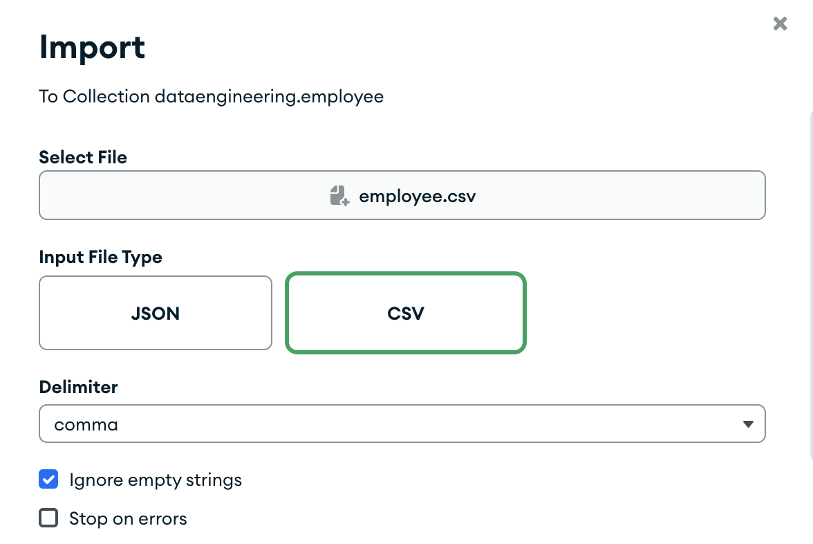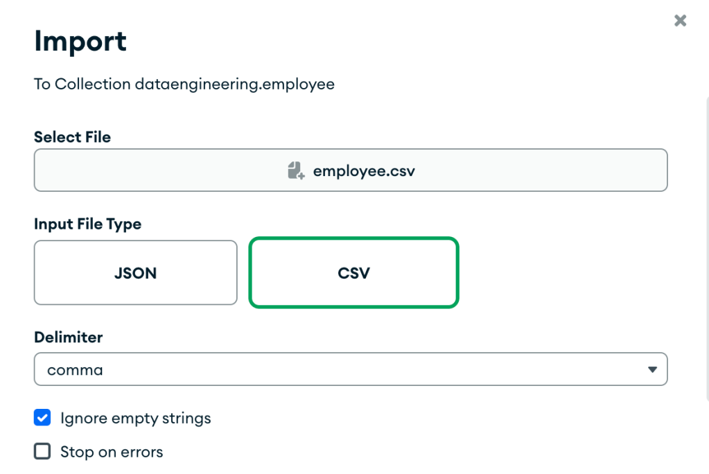 Pass database name as ‘dataengineeing’ and collection name as ’employee’ . Open collection and click on import, select employee.csv file from GitHub repo.