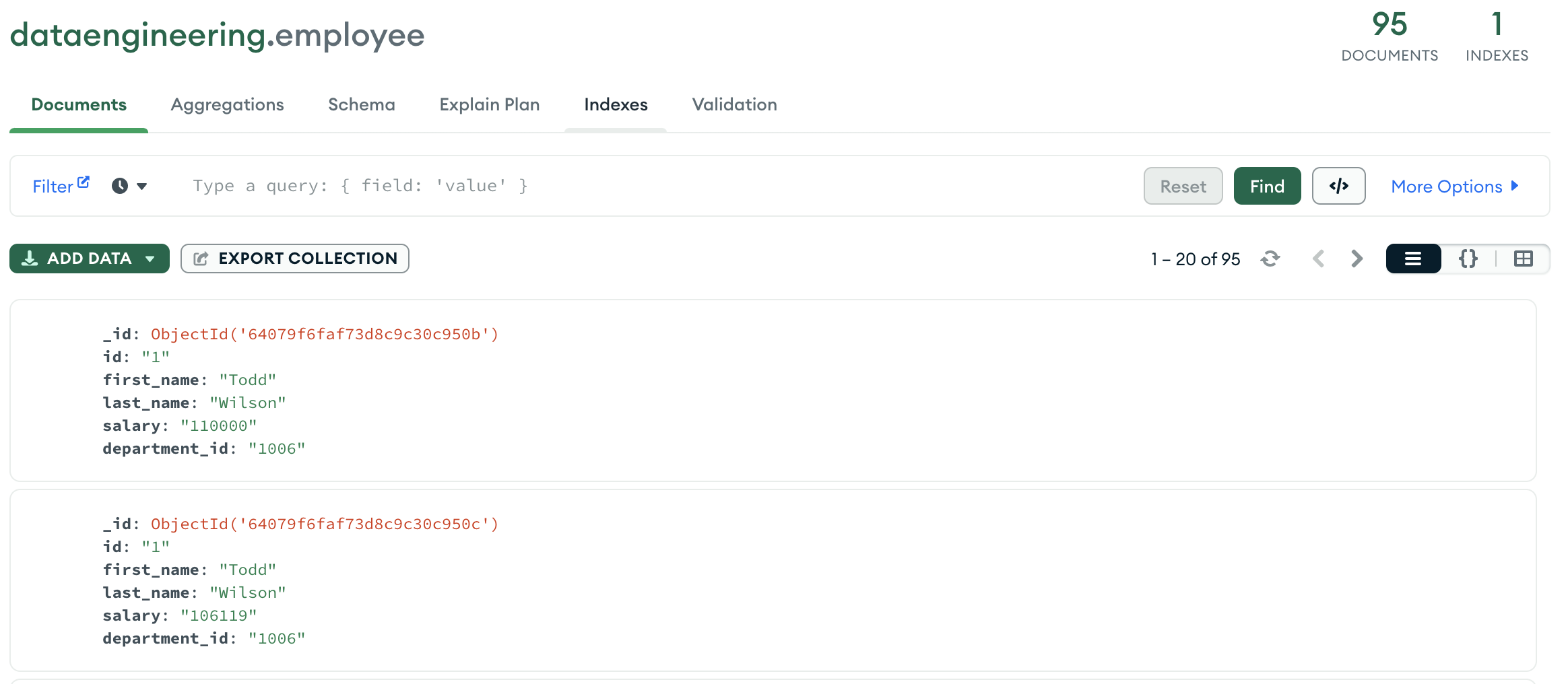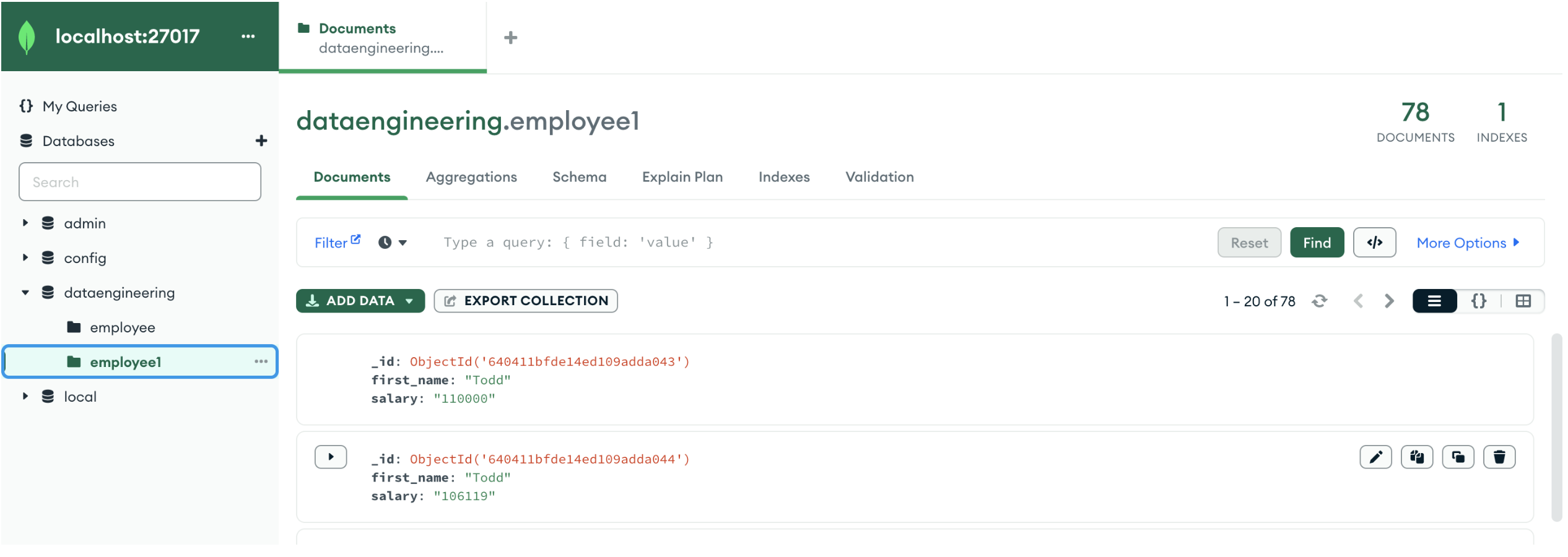 This will check if ’employee1′ collection is there in MongoDB or not. If it is there, it will just load data. If not it will create collection and load data.
