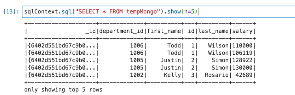newdf = sqlContext.sql("SELECT first_name,salary FROM tempMongo WHERE salary > 50000")
