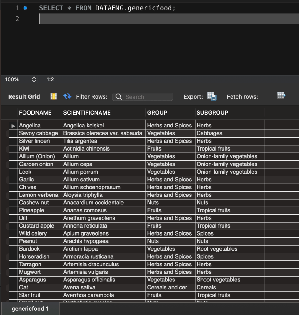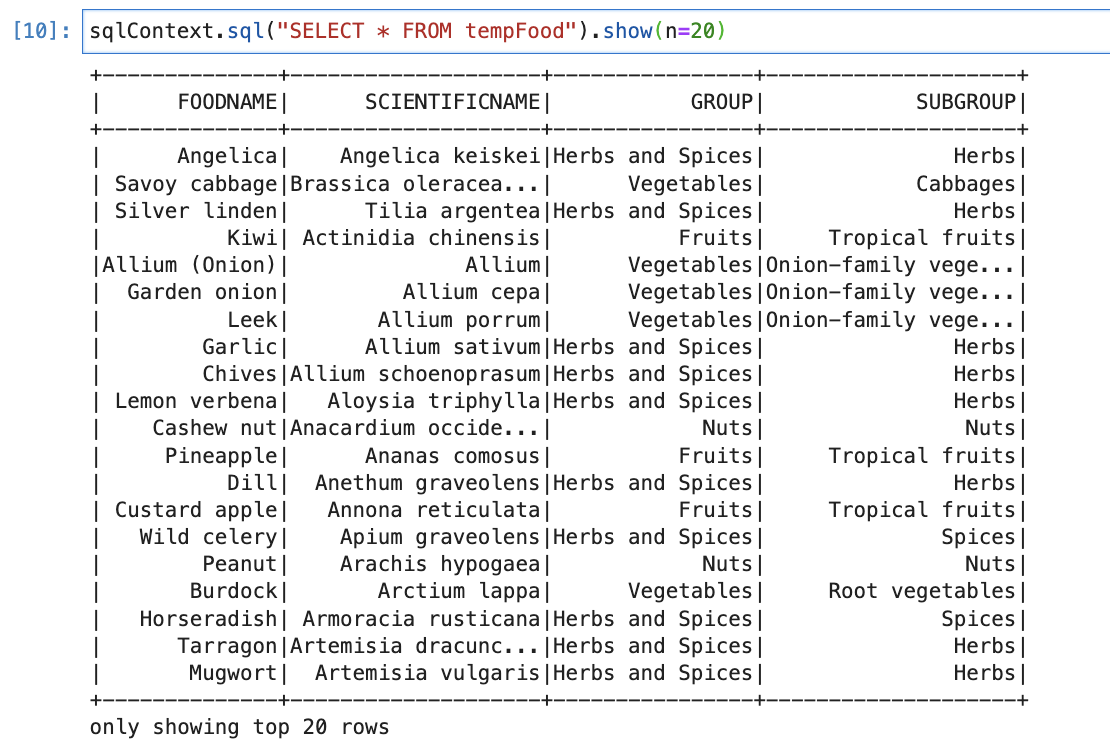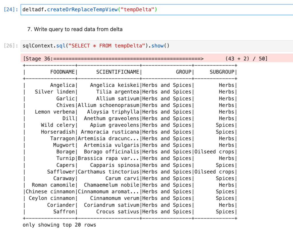 We will now explore this table using Spark SQL and we will load the top two highest-grouped food into delta format and create a delta table. In the first instance, we will load the top highest group food into the table.
