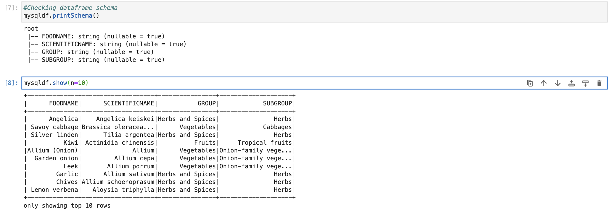 Once the connection was created successfully and loaded data into the data frame. We will check schema and sample data from the data frame.