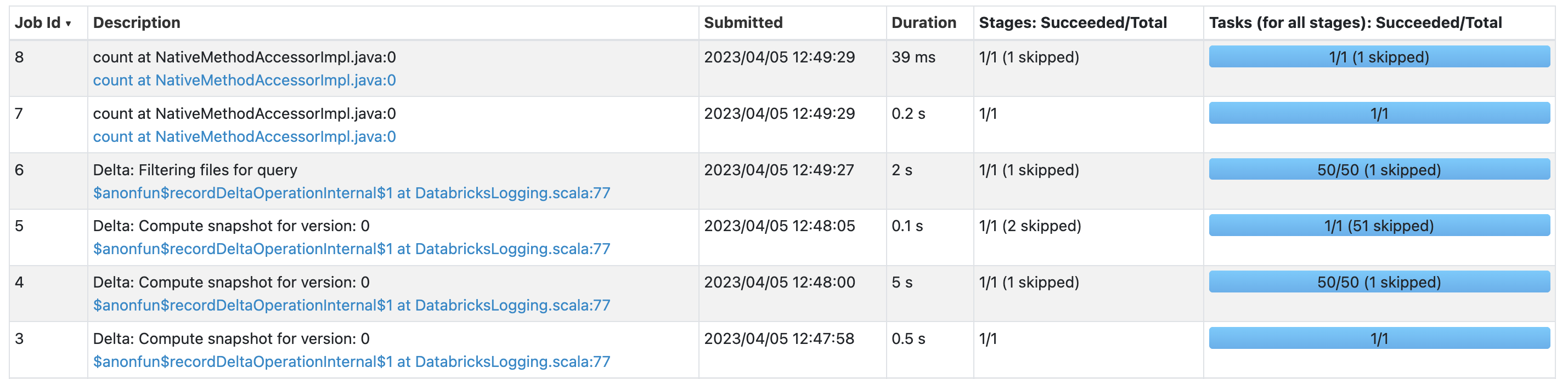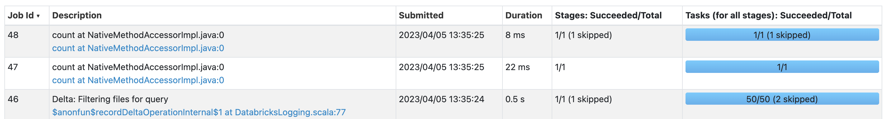 As per the Spark application dashboard, it took around 5 seconds to create a table and for our read query, it took around 2 seconds.