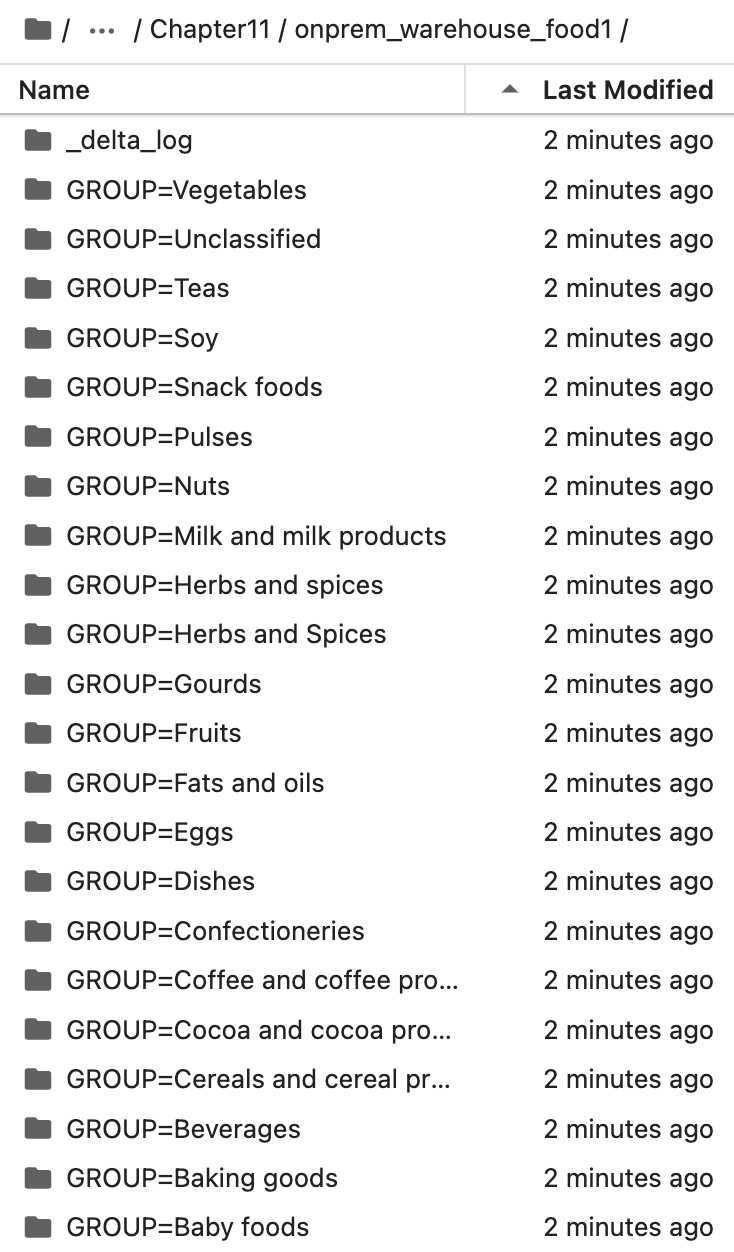 We have created a delta table with the food group as a partition, so at the file server level, it will create a folder as below.