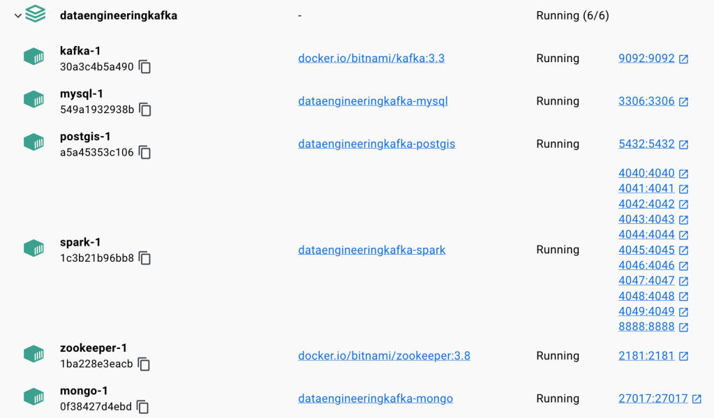 Once you cloned the GitHub repo for the Data Engineering suite. Create an image and start docker containers using docker-compose. We will see the containers below running.