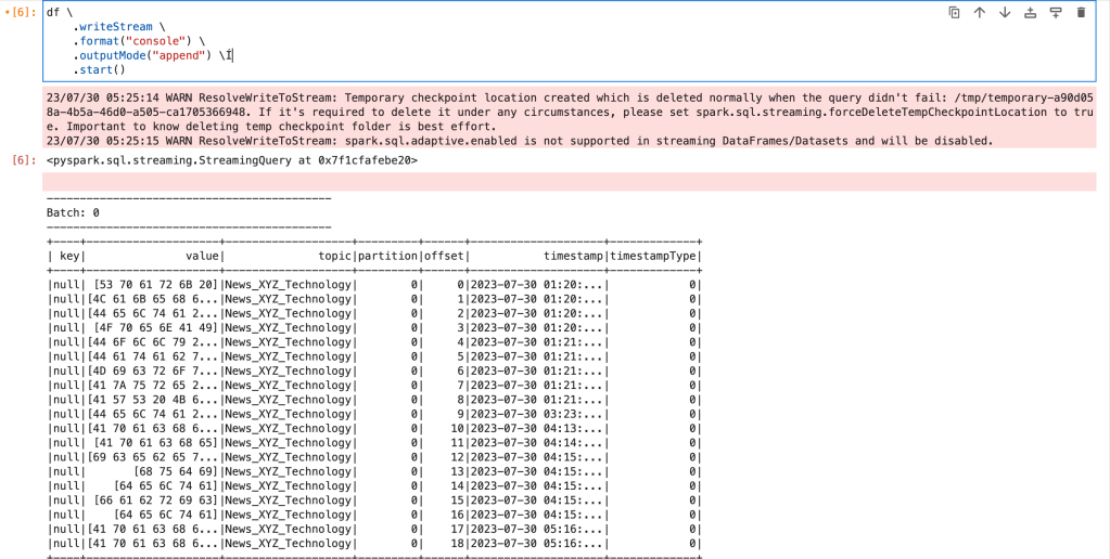 Now, we will register our Spark application as a consumer using Spark structured streaming. We will use the below code to connect the Kafka server and topic.