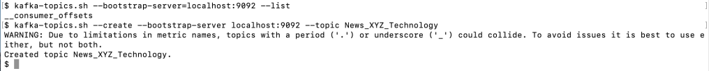 kafka-topics.sh –create –bootstrap-server localhost:9092 –topic News_XYZ_Technology