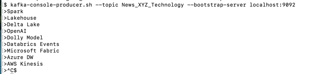 kafka-console-producer.sh –topic News_XYZ_Technology –bootstrap-server localhost:9092