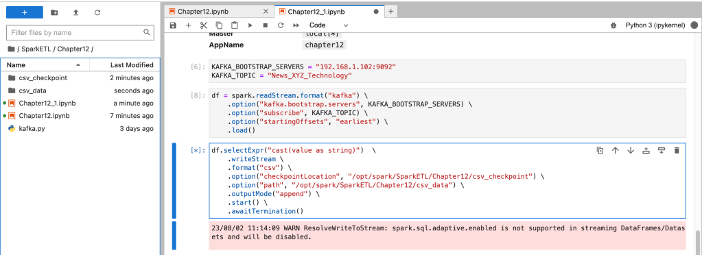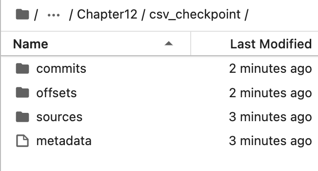 .option("checkpointLocation", "/opt/spark/SparkETL/Chapter12/csv_checkpoint") \