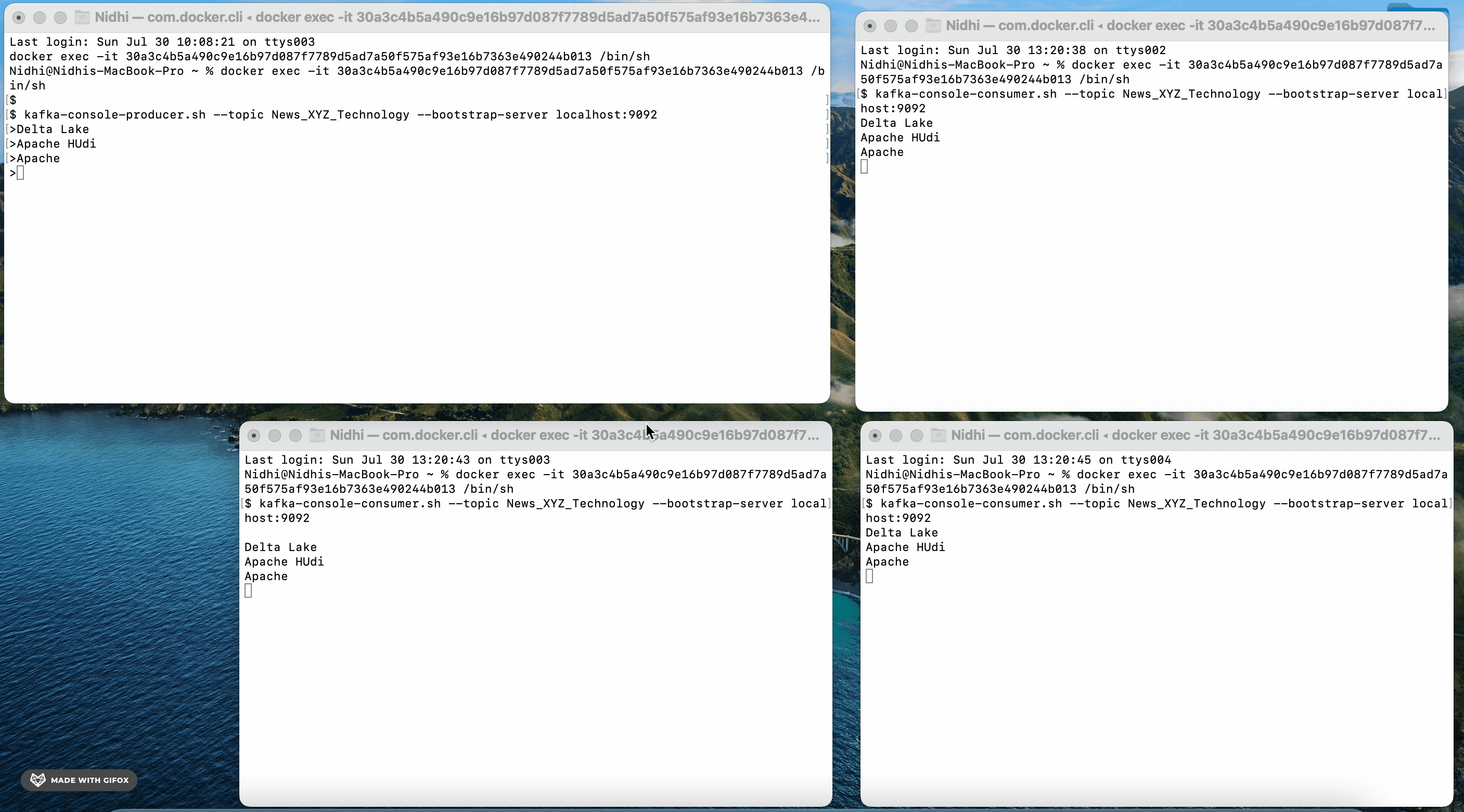 Now, we will open multiple terminals. One will be the publisher publishing messages and 3 consumers, who have subscribed for the same topic. So when publishers will publish messages all consumers will get immediately get messages.