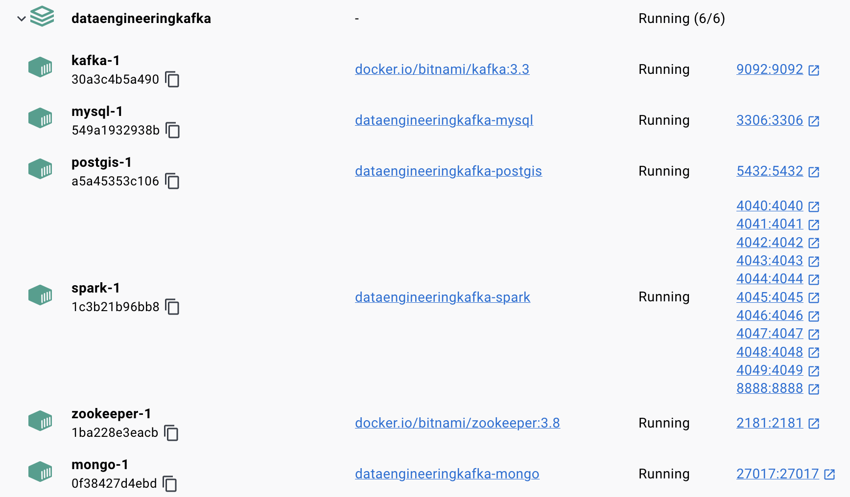 Once you cloned the GitHub repo for the Data Engineering suite. Create an image and start docker containers using docker-compose. We will see the containers below running.