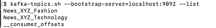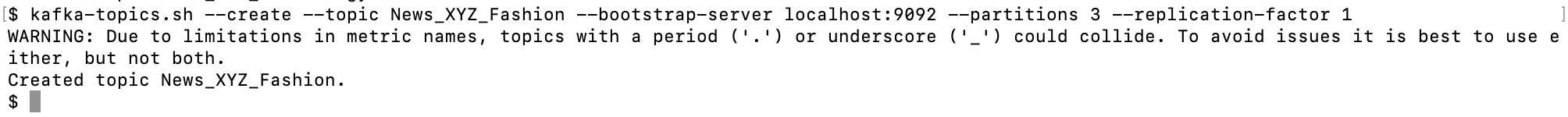 kafka-topics.sh –create –topic News_XYZ_Fashion –bootstrap-server localhost:9092 –partitions 3 –replication-factor 1