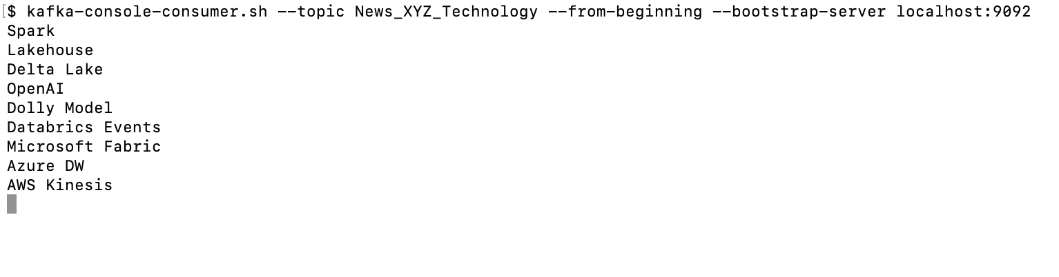 kafka-console-consumer.sh –topic News_XYZ_Technology –from-beginning –bootstrap-server localhost:9092